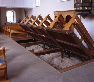 Unter den Kirchenbänken der Alten Pfarrkirche St. Maria und Ulrich verbirgt sich viel Geschichte. Bereits 1951 kamen bei Ausgrabungen Überreste älterer Sakralbauten und eines römischen Gutshofs zum Vorschein. Zwei später entdeckte römische Brandgräber und frühmittelalterliche Grubenhäuser in der nahen Umgebung ergänzen das eindrucksvolle Bild einer kontinuierlichen Besiedlung über viele Jahrhunderte. Neue Informationstafeln vor der Kirche vermitteln spannende Einblicke in die Geschichte dieses bedeutenden Ortes. Klappen Sie die Kirchenbänke hoch und werfen Sie einen direkten Blick auf die archäologischen Spuren!